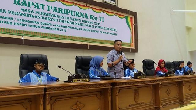 Bupati Inhil, HM Wardan sebelum memberikan arahannya, memimpin puluhan anak peserta Jambore PMKS untuk meneriakkan yel-yel khas Jambore. Teriakan penuh semangat para peserta pun bergemuruh hingga ke luar gedung wanita yang menjadi lokasi pelaksanaan acara penutupan Jambore / Ramah Tamah Anak-anak PMKS se-Kabupaten Inhil.