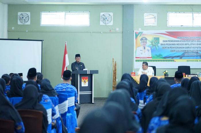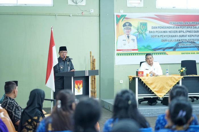 TEMBILAHAN, RIAUONE.COM- Pemerintah Kabupaten (Pemkab) Indragiri Hilir (Inhil) menggelar Pelantikan dan Pengambilan Sumpah Janji Pegawai Negeri Sipil (PNS), Pengangkatan Pertama Pejabat Fungsional serta Penyerahan SK CPNS Lulusan PTDI-STTD Kementerian Perhubungan di Lingkungan Pemerintah Kabupaten Inhil, Rabu (15/03/2023) di salah satu Hotel yang ada di Tembilahan.