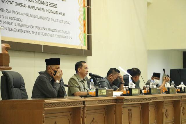 TEMBILAHAN - Dewan Perwakilan Rakyat Daerah (DPRD) Indragiri Hilir menggelar Rapat Paripurna tentang Laporan Keterangan Pertanggungjawaban (LKPJ) Pelaksanaan APBD Inhil tahun 2021, Penyertaan Modal Daerah kepada BPR Gemilang serta Perubahan Peraturan tentang Badan Permusyawaratan Desa.
