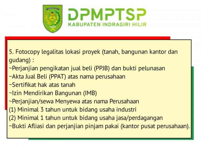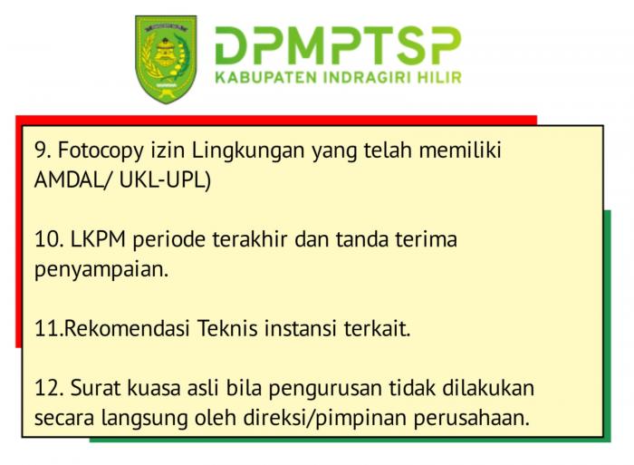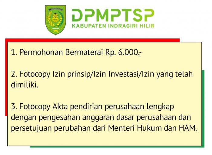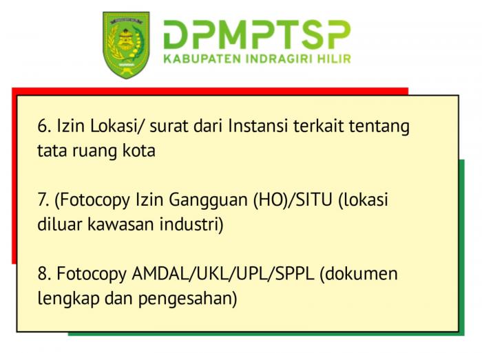 Kepala DPMPTSP Inhil, Haryono, kepada awak media di Tembilahan belum lama ini menyebutkan terdapat 12 syarat administrasi yang haus di lengkapi. Syarat Administrasi dimaksudkan diantaranya sebagai berikut.