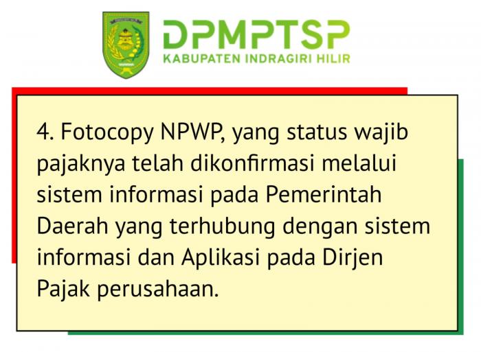 4. Fotocopy NPWP, yang status wajib pajaknya telah dikonfirmasi melalui sistem informasi pada Pemerintah Daerah yang terhubung dengan sistem informasi dan Aplikasi pada Dirjen Pajak perusahaan.