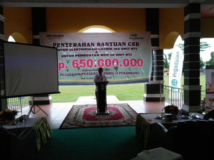Arifmon dalam sambutannya mengatakan tahun 2017 ini Program Corporate Responsibility PT. pegadaian (Persero) wilayah II Riau,Sumbar,Kepri menyalurkan bantuan berupa kegiatan pembuatan MCK dan Elektrifikasi di wilayah Kuansing sebesar Rp. 650 juta. Rinciannya yaitu pembangunan mck sebanyak 50 unit, dan pemasangan elektrifikasi listrik rumah tangga sederhana 450 VA sebanyak seratus unit seluruhnya tersebar di Kec. Kuantan Tengah ujar Arifmon.