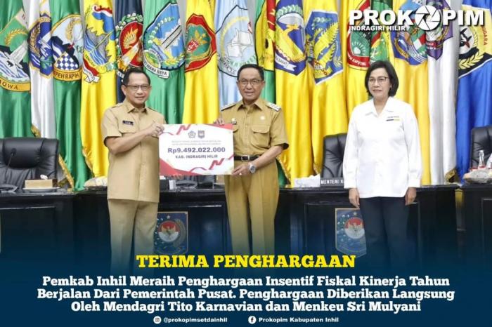 Penghargaan pengendalian Inflasi itu diganjar dengan insentif fiskal senilai 9,492 milyar rupiah untuk inhil diberikan langsung oleh Menteri Dalam Negeri (Mendagri) Tito Karnavian bersama Menteri Keuangan (Meukeu) Sri Mulyani di Hall Sasana Bhakti Praja di Gedung Utama Kemendagri, Jakarta.