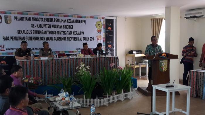 KUANSING,- Pelantikan Anggota PPK Se Kabupaten Kuantan Singingi secara resmi dilantik Kamis (9/11/2017) bertempat di hotel Angela Teluk Kuantan. Ketua Komisi Pemilihan Umum (KPU) Kabupaten Kuansing H Firdaus Umar,SH melantik 74 anggota PPK Se- Kabupaten Kuansing tersebut. Pelantikan dihadiri Bupati Kuansing Drs.H Mursini didampingi Kapolres, Kasi Intel Kajari, Ketua Panwas Kabupaten, Kadis Kesbangpol dan Kasatpol PP.