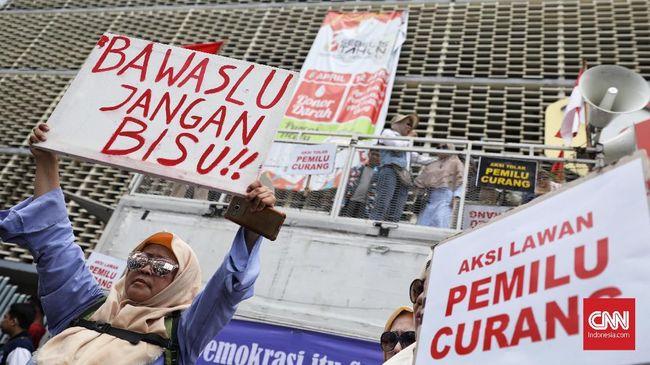 Massa yang hadir di depan Bawaslu didominasi oleh kalangan wanita atau emak-emak. Mereka membawa spanduk dan poster bertuliskan 'tolak pemilu curang'.