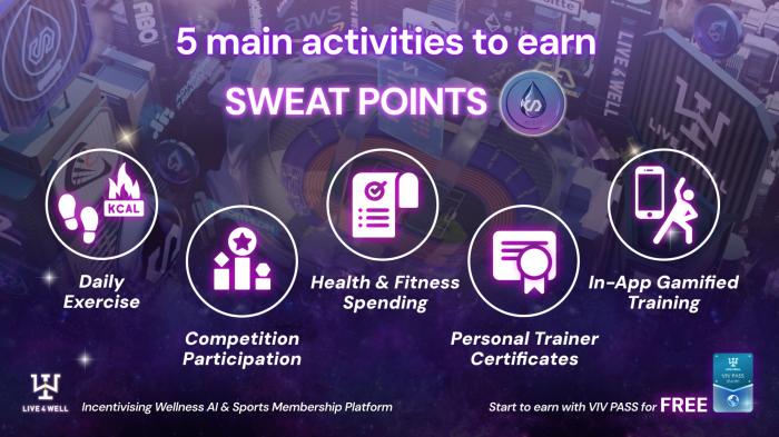 The current plan allows global users to participate with no barriers. Five main activities earn Sweat Points: