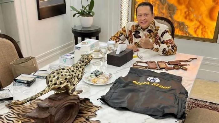 NASIONAL, - Ketua MPR RI Bambang Soesatyo atau Bamsoet mendapat sorotan setelah video yang memperlihatkan saat ia berbincang dengan tamunya, tampak di atas meja kerjanya terdapat opsetan kulit harimau, sebagai satwa yang dilindungi. Diduga bahwa taplak meja tersebut dibuat dari kulit harimau yang diawetkan.