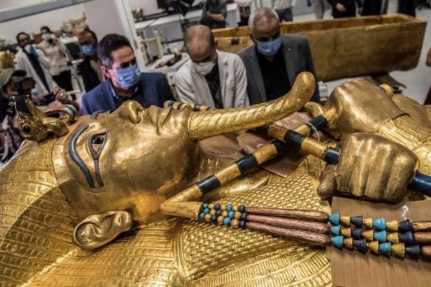 Giza, Mesir - Sarkofagus emas Firaun Tutankhamun Mesir kuno saat pemulihan di laboratorium Museum Mesir Grand yang baru dibangun, pada 13 April. (*).