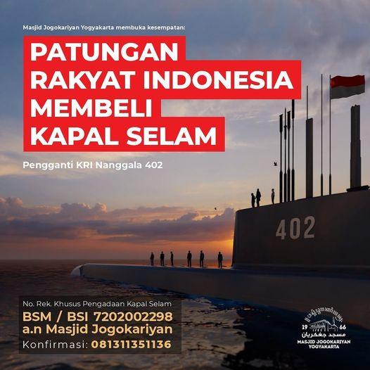 NASIONAL, - Masjid Jogokariyan Yogyakarta mengajak masyarakat membeli kapal selam pengganti KRI Nanggala 402. Dana yang terkumpul di rekening Masjid Jogokariyan saat ini tembus Rp 1 miliar selama tiga hari.