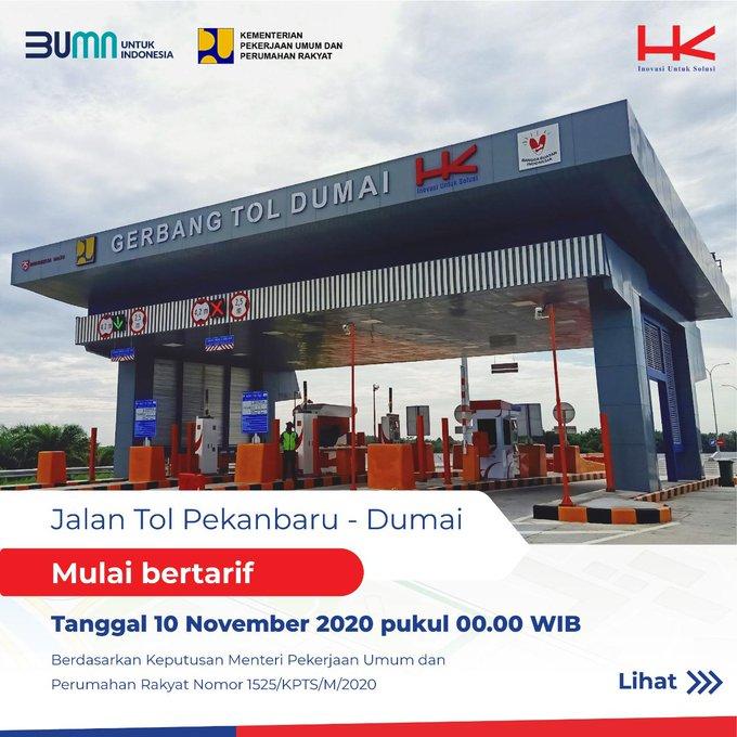 NASIONAL, - Mulai tanggal 10 November 2020, pukul 00.00 WIB, Jalan Tol Pekanbaru - Dumai mulai diberlakukan tarif. Demikian diumumkan oleh Hutama Karya melalui akun twitter-nya Hutama Karya @HutamaKarya.