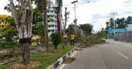 RIAUONE.COM, TEMBILAHAN - Kawasan Jalan Swarnabhumi Tembilahan yang dulu teduh, saat ini menjadi 'gersang', karena dahan-dahan pohon Angsana yang berdaun rindang habis dipangkas.