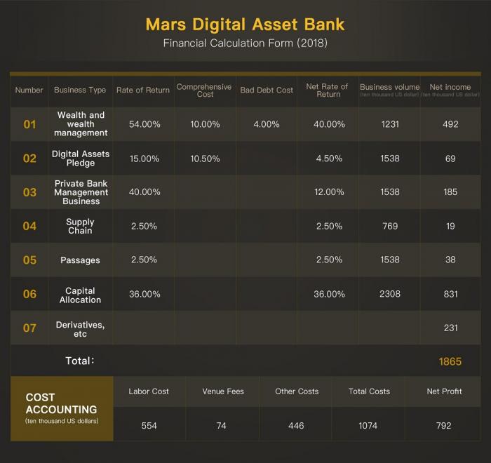 As one major business of BihuEx Fund and backed by 500,000 BihuEx users, the registered users of Mars Digital Asset Bank are expected to exceed 300,000 by the end of 2018, with its business scale surpassing USD1.5 billion and profits up to USD18.65 million. To speed up its development and meet capital requirements on technical security, global promotion, team building, license applying and provisions for banking turnover, Mars Digital Asset Bank plans to raise USD 9.5 million by releasing 8% of its total shares in the first phase of offering.