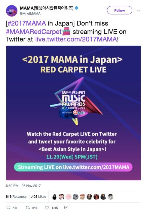 For the first time, the '2017 MAMA' red carpet will be livestreamed onTwitter via a special live page live.twitter.com/2017MAMA and fans canexclusively vote for the Best Asian Style Awards by Tweeting with thehashtags #MAMARedCarpet and #NameOfArtist. Celebrities with the mostnumber of Tweet votes from the red carpet in each of the two cities willbe awarded the Best Asian Style prize during the main ceremony inYokohama and in Hong Kong respectively.