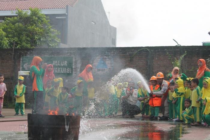 Dari truck tangki BPBD, bersama Agung Hartono, dkk, anak-anak KB Al-Azhar di ajari menggunakan helm safety, rompi, memegang selang, dan cara menyemprotkan air yang tepat pada titik api.