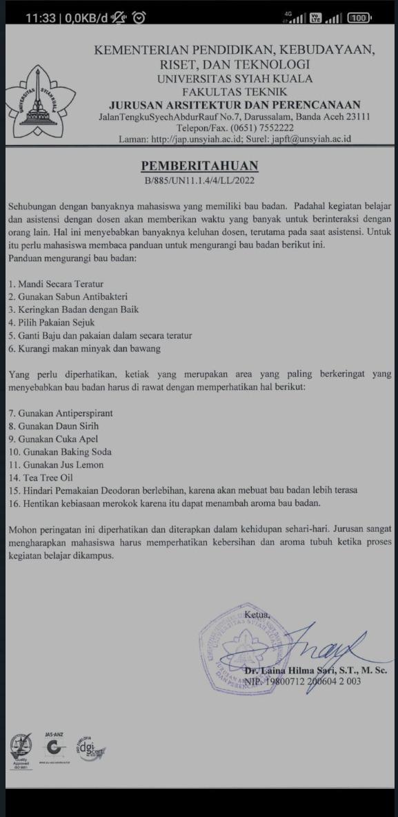 Jurusan sangat mengharapkan mahasiswa harus memperhatikan kebersihan dan aroma tubuh ketika proses balajar di kampus," demikian isi surat yang ditandatangai oleh ketua Jurusan, Dr Laina Hilma Sari ST MSc.