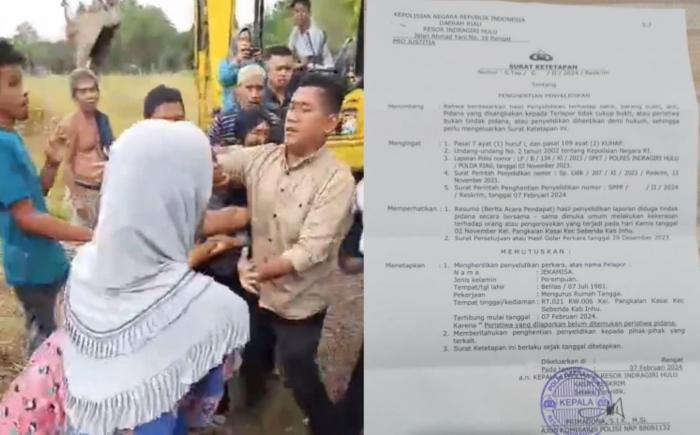 Jekamisa yang dianiaya dengan cara diseret, dicakar, ditendang dan dipukul oleh gerombolan orang yang masuk ke areal tanah miliknya Kamis 2 November 2023 kemarin, dilaporkan ke Polres Inhu dengan bukti jilbab, masker dan bukti visum, namun perkara tersebut tidak ditemukan pidananya dan dihentikan dengan diterbitkan surat ketetapan nomor: S.Tap/6/II/2024/Reskrim tentang penghentian penyelidikan.