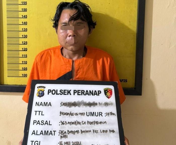 Pelaku Curanmor itu berinisial DI (27), warga Desa Banjar Balam, Kecamatan Lirik, diringkus unit Reskrim Polsek Peranap, Kamis 16 Mei 2024, pukul 13.00 WIB di sebuah warung Desa Pandan Wangi, Kecamatan Peranap bersama sepeda motor hasil curian, Honda Supra X 125R, dengan plat nomor polisi B 6229 ESB.