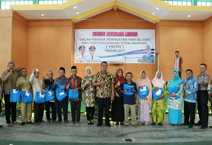 BINTAN, KEPRI, - Dalam rangka Peringatan Hari Kesetiakawanan Sosial Nasional (HKSN) yang ke 89 di Kabupaten Bintan, Bupati Bintan H Apri Sujadi, S.Sos bersama Ketua Lembaga Koordinasi Kesejahteraan Sosial (LK2S) Kabupaten Bintan Ibu Hj Deby Apri Sujadi berbagi kasih bersama Ratusan Kaum Lansia di GOR Simpang Lagoi dan di Lapangan Bola Desa Berakit , Kec Teluk Sebong.