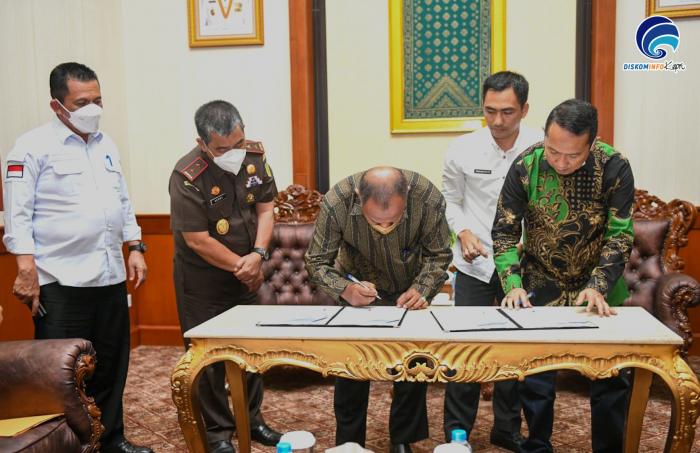 Turut menyaksikan penandatanganan kontrak tersebut Asisten Perdata dan Tata Usaha Negara Kejati Kepri Alex Sumarna, Asisten Intelijen Kepri Lambok MJ Sidabutar, dan Kepala Dinas PU Provinsi Kepri Abu Bakar. (dsk/tio/jlu)