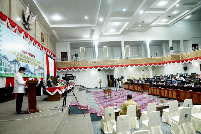 KEPRI, PROVINSI, - Plt. Gubernur Kepulauan Riau H. Isdianto menyampaikan jawaban atas pemandangan umum fraksi-fraksi DPRD Provinsi Kepulauan Riau Terhadap Ranperda tentang Laporan Pertanggungjawaban Pelaksanaan APBD tahun anggaran 2019 di ruang sidang utama kantor DPRD Kepri, Dompak, Tanjungpinang, Selasa (30/6).