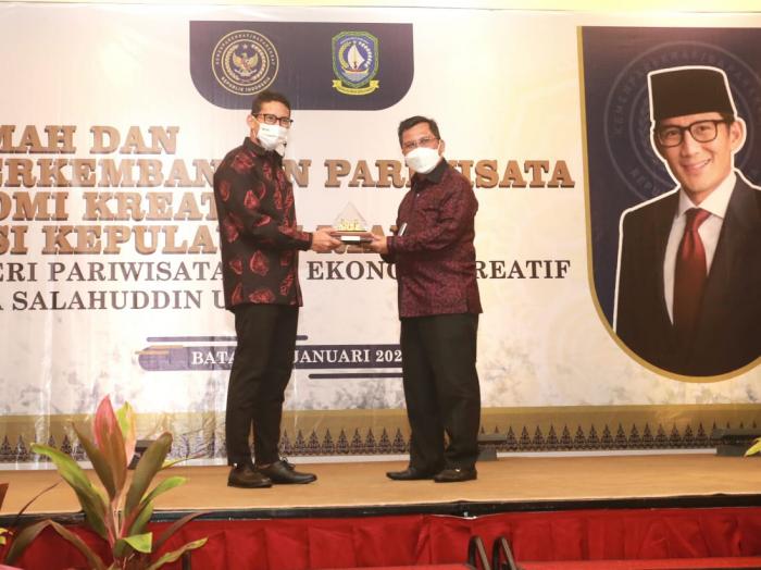 Pada kesempatan tersebut juga dilakukan penyerahan cenderamata berupa Plakat Pariwisata Kepri Bangkit Lagi dan Launching Kalender of Event Kepri Tanggal 5 -7 Februari 2021 di Kota Batam kepada Menparekraf Sandiaga Uno oleh Sekdaprov Kepri TS Arif Fadillah.
