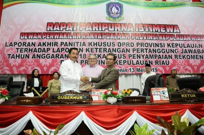 KEPULAUANRIAU, - Gubernur H Nurdin Basirun menghadiri Rapat Paripurna dengan agenda Laporan Akhir Pansus DPRD Provinsi Kepri Terhadap Laporan Keterangan Pertanggung Jawaban (LKPJ) Tahun Anggaran 2018 Sekaligus Penyampaian Rekomendasi DPRD Provinsi Kepri di Ruang Rapat Utama kantor DPRD, Pulau Dompak, Tanjungpinang, Senin (13/5).