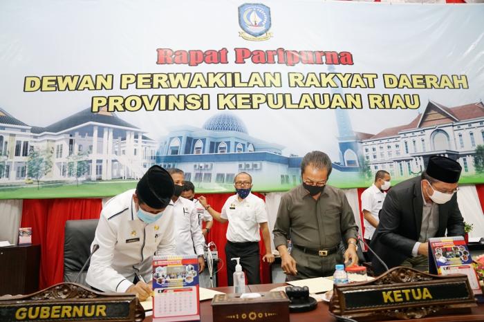 Dan sebagai bentuk persetujuan bersama, pengesahan Perda ini ditandai dengan saling menandatangani dokumen pengesahan oleh Gubernur dan ketua DPRD Kepri.