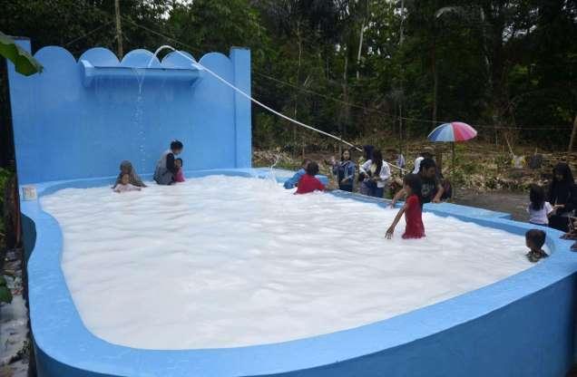 NUSANTARA, - Sejumlah warga bermain di kolam air berwarna putih menyerupai air susu di Kecamatan Bontomarannu, Kabupaten Gowa, Sulawesi Selatan, Sabtu (7/3/2020).