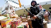 PALU — TNI AL mendistribusikan bantuan logistik kepada korban gempa dan tsunami di Sulawesi Tengah (Sulteng) di dermaga Pantoloan Palu. Bantuan tersebut diberangkatkan dengan KRI Ahmad Yani-35 dari Makassar.