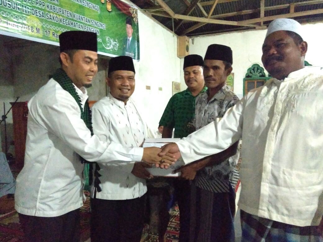 Foto : Wakil ketua I DPRD Kuansing Sardiyono menyerahkan Bantuan di Mesjid Al-Muhajirin Desa Geringging Baru Kecamatan Sentajo raya