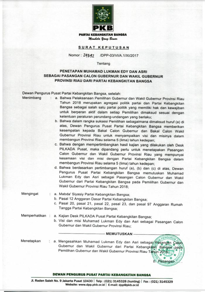 DPP PKB Keluarkan SK Penetapan Lukman Edy-Asri di Pilgub Riau 2018