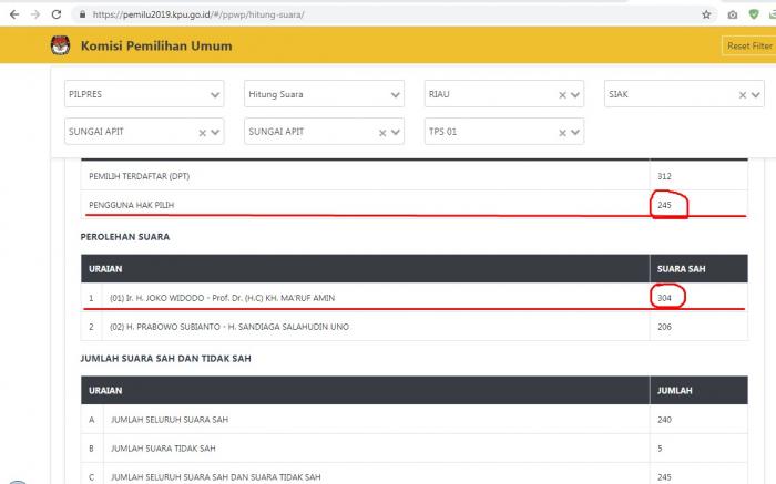 - Di Website KPU RI, Pengguna Hak Pilih di Siak Riau 245 bagaimana bisa Capres 01 dapat 304 Suara?