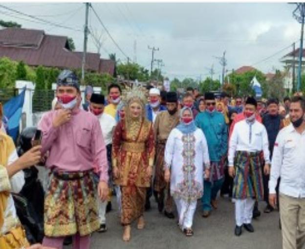 Calon Bupati Bengkalis terkuat ini di arak oleh ratusan orang diiringi musik kompang menuju kantor KPU di Jalan Pertanian, Bengkalis