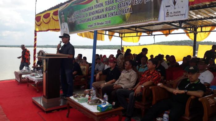 Pada acara tersebut sekaligus dilakukan penebaran benih ikan sebanyak 20.000 ekor terdiri dari ikan Patin, Baung, Tawas dan ikan mas dan penanaman pohon pelindung di pinggiran bendungan yang secara serimoni dilakukan Bupati Mursini.