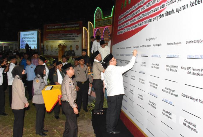 Dalam kesempatan itu dan sebagai komitmen bersama, Kapolda Riau, Kabinda, Danrem 031, Pemerintah Kabupaten Bengkalis, dan Instansi Vertikal serta para tokoh agama, tokoh masyarakat, tokoh pemuda dan pengurus organisasi, melakukan penandatanganan usai mendeklarasikan pernyataan untuk menolak segala bentuk informasi hoax, dipandu Bupati Bengkalis Amril Mukminin, diwakili Sekretaris Daerah H Bustami HY.