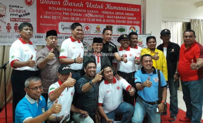 DUMAI, - Hadiri Peringatan HPN Propinsi Riau,Bupati H.M.Harris Kunjungi PMI Dumai, Bupati Pelalawan H.M.Harris saat berfoto bersama saat kunjungan di posko donor darah di Hotel Grand Zuri Duri.