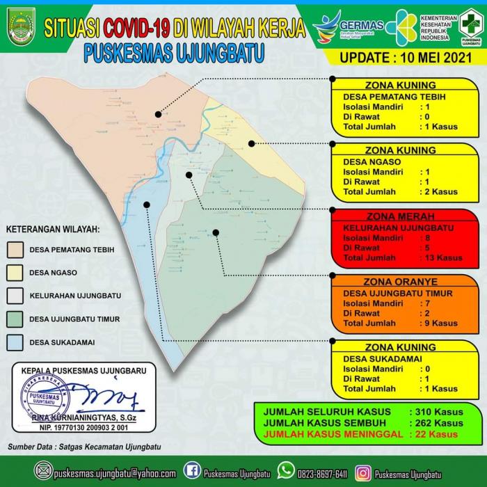 "Di Kelurahan Ujungbatu sendiri sudah masuk Zona Merah, karena terdapat lebih dari 10 kasus Covid - 19, untuk jumlah kasus yang meninggal sudah mencapai 22 orang untuk wilayah kecamatan Ujungbatu ini, mudah mudahan di wilayah kita ini diharapkan tidak adalagi yang meninggal karena Covid-19", Harapnya.