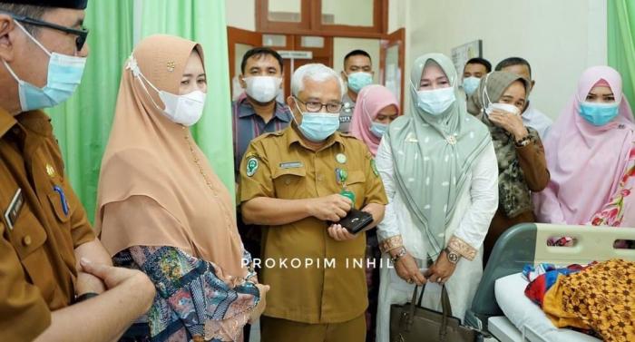 INHIL, TEMBILAHAN, - Hj Zulaikhah Wardan SSos ME menjenguk korban kecelakaan pompong bernama Siti Mardiah di RSUD Puri Husada Tembilahan, Senin (10/5/2021).