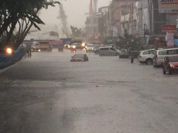 PEKANBARU, RIAU, NUSANTARA, - Hujan lebat yang mengguyur kota Pekanbaru selama lebih dua jam semalam, Senin (9/5/2016) membuat banjir dimana-mana. Bahkan jalan-jalan utama dalam kota menjelma sungai. Ketinggian air sepaha orang dewasa.