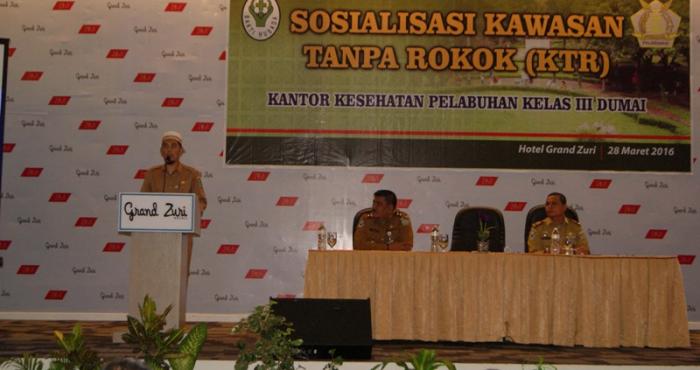 RIAUONE.COM, DUMAI - Kantor Kesehatan Pelabuhan (KKP) Kelas III Dumai melakukan sosialisasi Kawasan Tanpa Rokok (KTR) bagi masyarakat Kota Dumai. Sosialisasi yang dilaksanakan di aula Hotel Grand Zuri Dumai tersebut, dibuka oleh Kepala Dinas Kesehatan Kota Dumai H. Paisal SKM. MARS, Senin (28/3).