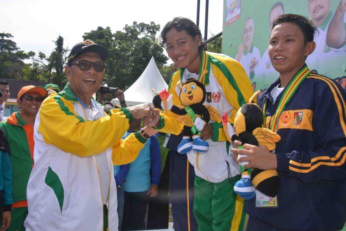 Bupati Kampar H Azis Zaenal juga didaulat untuk mengalungkan medali emas kepada perenang Kampar Syuci Indriani yang membuka perolehan medali Porprov IX 2017 dari nomor 200 meter gaya bebas putri.