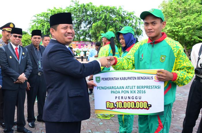 BENGKALIS – Pada peringatan Hari Sumpah Pemuda ke-88 di Lapangan Tugu, Jumat (28/10/2016) sembilan atlit berprestasi Kabupaten Bengkalis pada ajang Pekan Olahraga Nasional (PON) Jawa Barat, menerima bonus penghargaan.