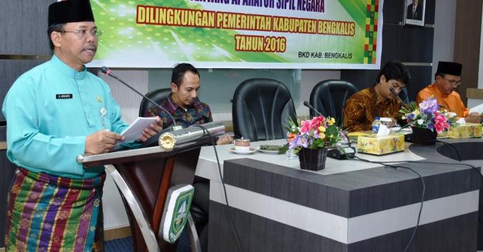 BENGKALIS, RIAU, - Plt Sekretaris Daerah H. Arianto membuka secara resmi Sosialisasi Undang–Undang Nomor 5 tahun 2014 Tentang Aparatur Sipil Negara (ASN) yang dilaksanakan dilantai II kantor Bupati. Kamis 28/07/2016.
