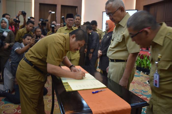 Diakhir acara, kepala daerah se-Provinsi Riau bersama Gubernur Riau melakukan penandatanganan hasil musrembang Provinsi Riau tahun 2017. (hms/zar).