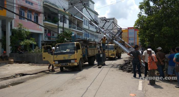 riauonecom, Duri, Bengkalis, - Tumbangnya enam tiang listrik di KM 4,5 Jalan Gajah Mada, Sebanga, Duri, mengakibatkan pasokan listrik padam sekitar 18 jam dinilai masyarakat