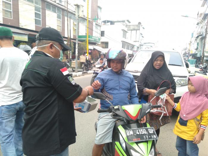 RIAUONE.COM, TEMBILAHAN- Pengurus DPC PKB Kabupaten Indragiri Hilir Tembilahan turun ke jalan membagikan masker kepada masyarakat guna mengantisipasi bahaya asap akibat kebakaran hutan dan lahan (Karhutla), Sabtu (14/9/2019) pagi di Tembilahan.