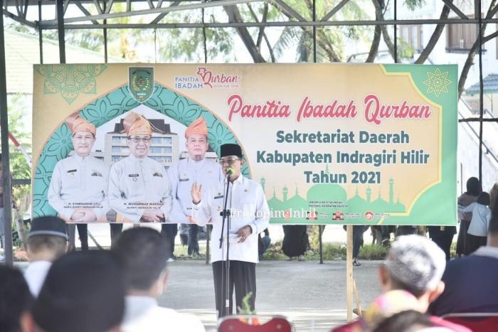 INHIL, Tembilahan - Hari Raya Idul Adha juga terkenal sebagai hari raya Qurban, maka perlu kesadaran dalam diri kita sebagai ummat Islam untuk berkuban. Hal ini disampaikan Bupati HM.Wardan saat menyaksikan pemotongan hewan kurban yang dilaksanakan Sekretariat Daerah (Setda) Kantor Bupati Jl.Akasia No.1 Tembilahan, Rabu (21/7/2021).