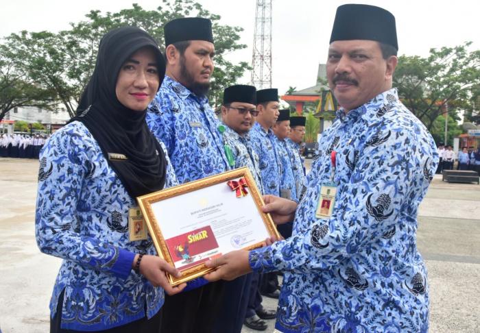 Penyerahan penghargaan ini dilakukan oleh Sekretaris Daerah Kabupaten Inhil H Said Syarifuddin saat peringatan HUT ke-46 Korpri, HUT ke-72 PGRI dan Hari Guru Nasional Tahun 2017 digelar di Lapangan Jalan Gajah Mada Tembilahan.