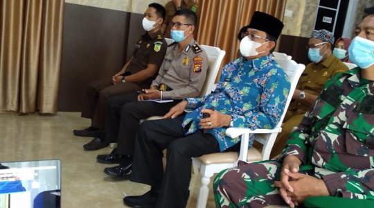 TEMBILAHAN - Bupati Indragiri Hilir (Inhil) Drs HM Wardan MP didampingi Sekretaris Daerah (Sekda) Drs H Afrizal MP beserta Unsur Forkopimda mengikuti peringatan Hari Otonomi Daerah (Otda) Ke XXV secara Virtual di Ruang Vidcon Diskominfo PS Tembilahan, Senin (26/04/2021).