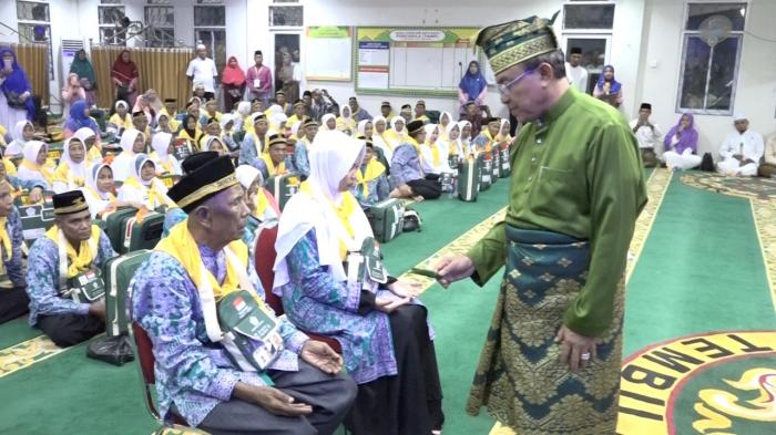 RIAUONE.COM, TEMBILAHAN- Bupati Kabupaten Inhil, HM Wardan melepas 119 Jamaah Calon Haji kelompok terbang (kloter) 20 asal Kabupaten Inhil menuju embarkasi antara Provinsi Riau di Pekanbaru, Senin (22/7/2019) malam, di Masjid Yayasan Amalbhakti Muslim Pancasila, Tembilahan.